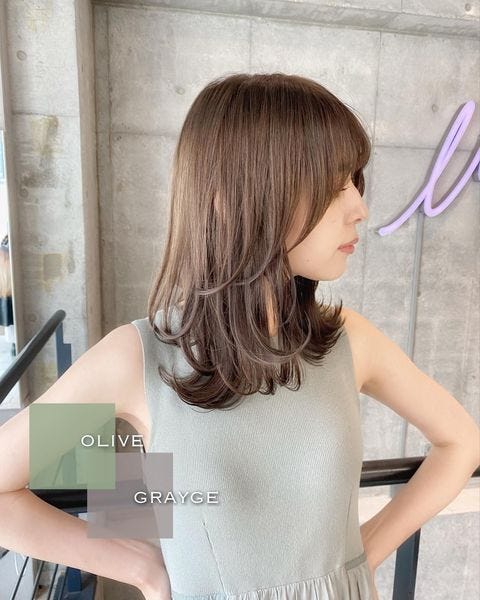 ヘアカラーは赤味のないオリーブベージュで、くすみカラーが得意なイエベ秋の方にぴったりです。