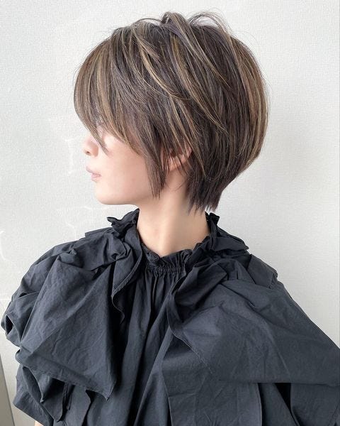 ハイライトカラーがたっぷり入った明るめカラーのシースルーショートは、上品さとおしゃれさを兼ね備えた2023年おすすめのヘアスタイルです。