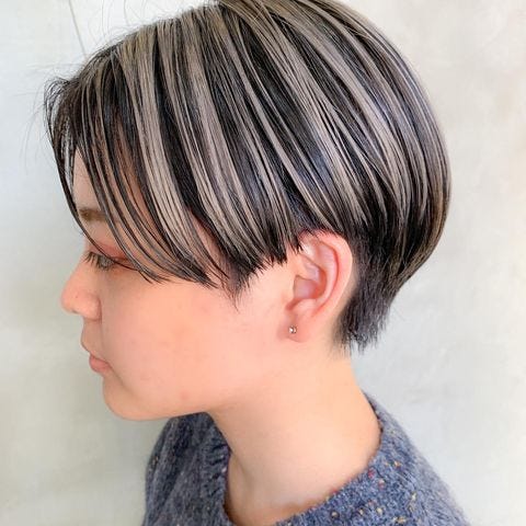 重ためのマッシュショートヘアは、ハイライトカラーをたっぷり入れた明るめカラーとの相性抜群です。