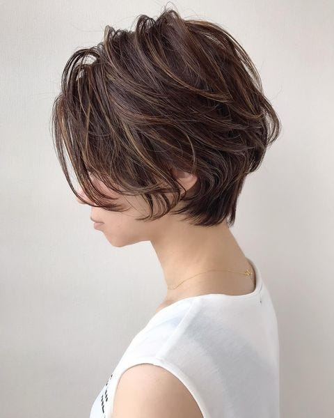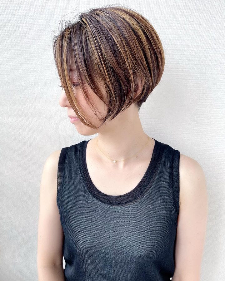 大人の女性に似合うのは、シークレットハイライトカラーを入れたショートヘアスタイルです。