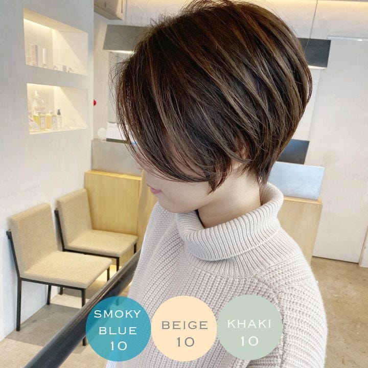 退色して黄色味が強くなった髪の毛にハイライトカラーを入れ、ブルーやベージュ、カーキ系のカラーを入れた素敵なショートヘアスタイルです。