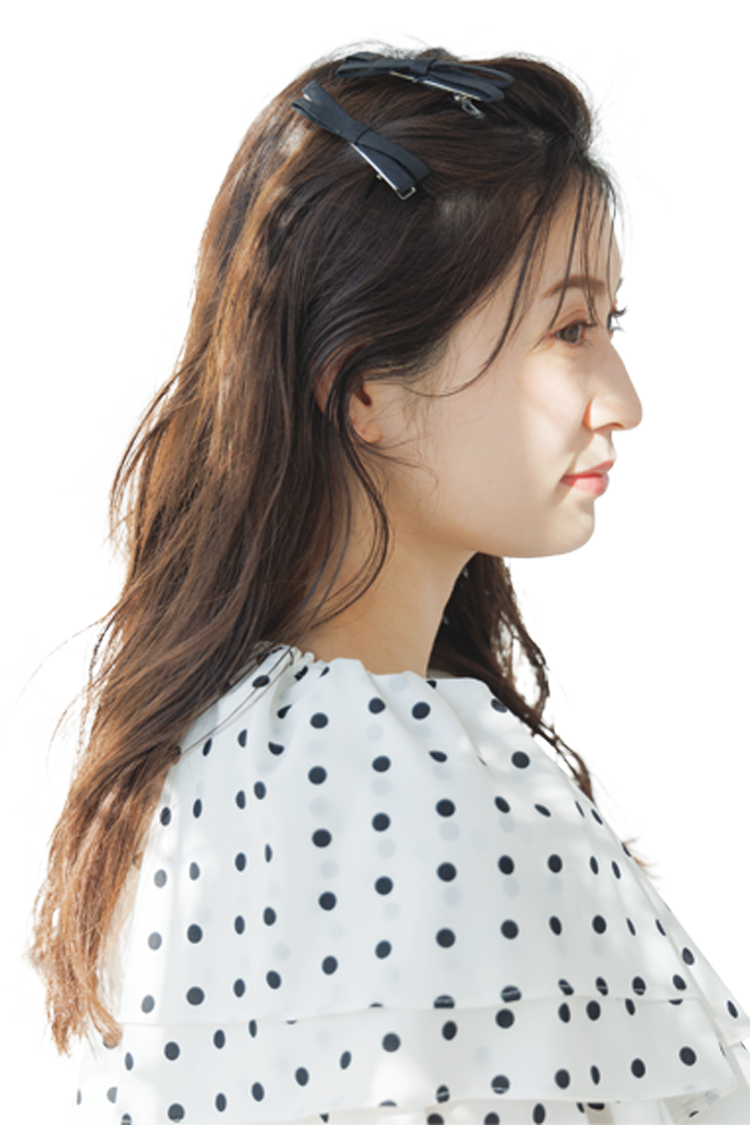 リボンつきのピンが甘いぶん、女のコらしい前髪を減らすバランス感がおしゃれに見せるコツ。顔まわりの毛量を変えるだけでも、イメチェンにつながるんです。