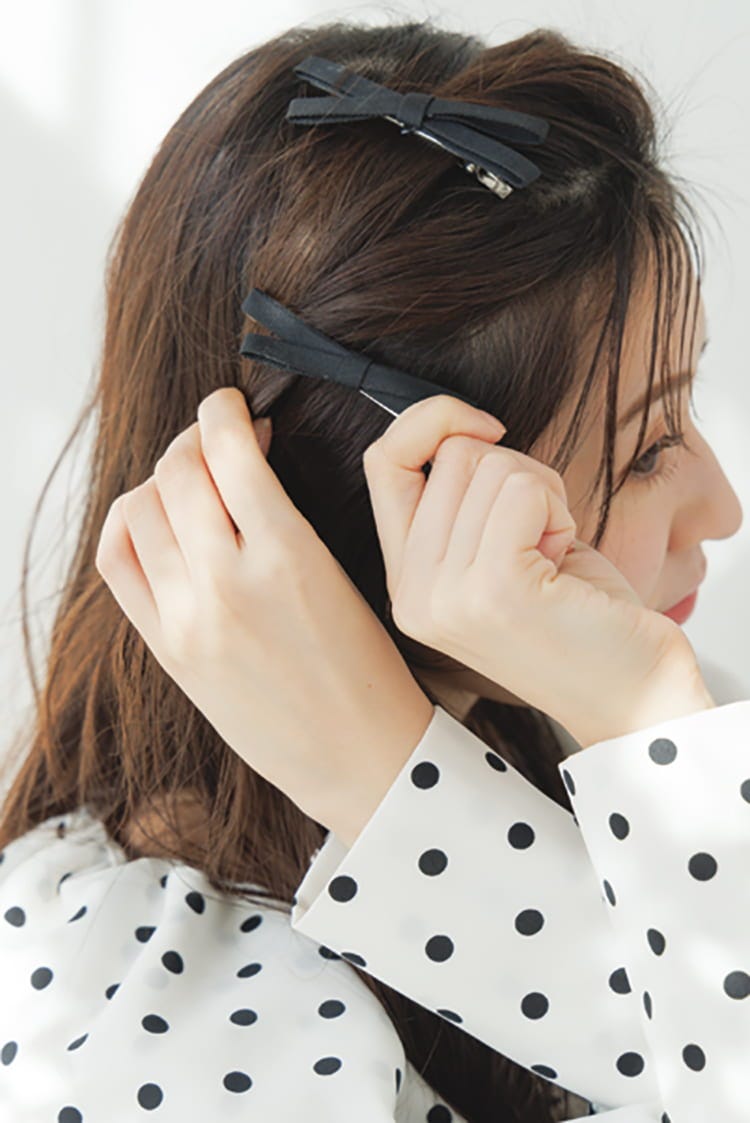 1でピンより下に出た髪とこめかみの髪をあわせて、もう1つピンをつける。2つのリボンピンの間隔は近くなりすぎないように。