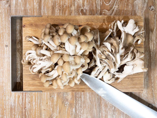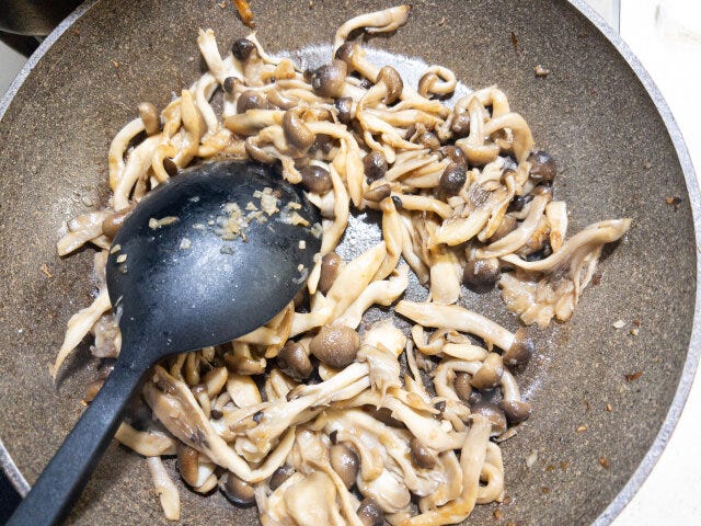 ② しめじは石づきを落としてほぐし、まいたけもほぐしておきます。