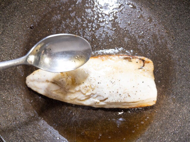 ⑤ さばは塩をしてしばらくおき、浮いてきた水分を拭き取ってコショウを振り、サラダ油を熱したフライパンに、皮目を下にして入れ、油をかけながら、片面をしっかり焼き色が付くまで焼き、フタをして1~2分蒸し焼きにして中まで火を通します。