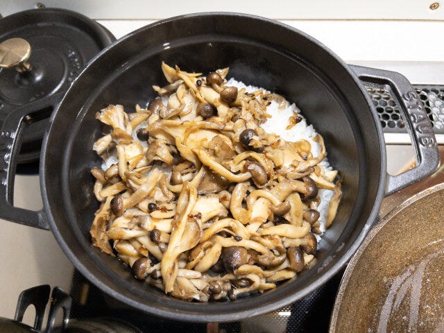 ④ ①の炊き上がったご飯の上に③を入れ、フタをしておきます。