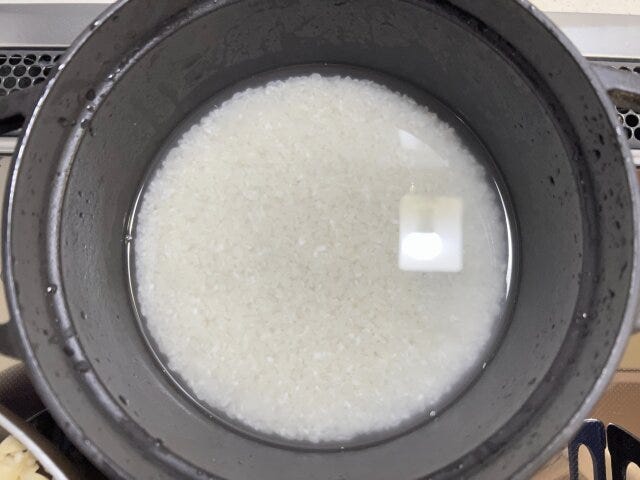 ① 米は研いで30分浸水させた後、水切りをして鉄鍋(STAUB)に入れ、水を加えて強火で加熱し、沸騰したら弱火にして10分炊き、火を止め10分蒸らします。