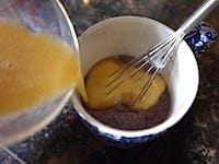 マグカップの粉類に卵液を少しずつ加え、だまがなくなるよう、全体をよく混ぜます。