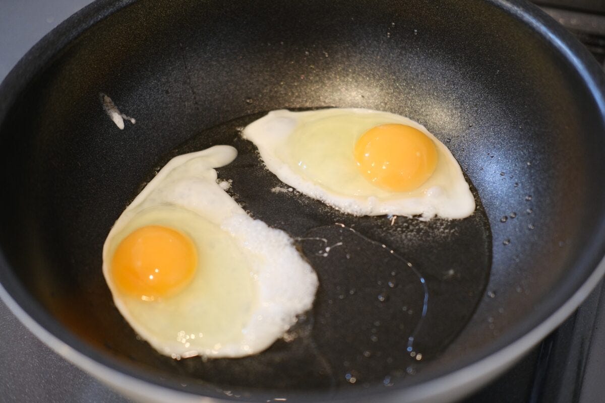 フライパンを中火にしてサラダ油(小さじ2)をひきます。油のうえに卵を乗せて目玉焼きを作り、塩を少し振りかけ、卵にも下味をつけます。初めに目玉焼きを作ることで、卵の香ばしさが出てチャーハンの旨みをアップしてくれるそう。
