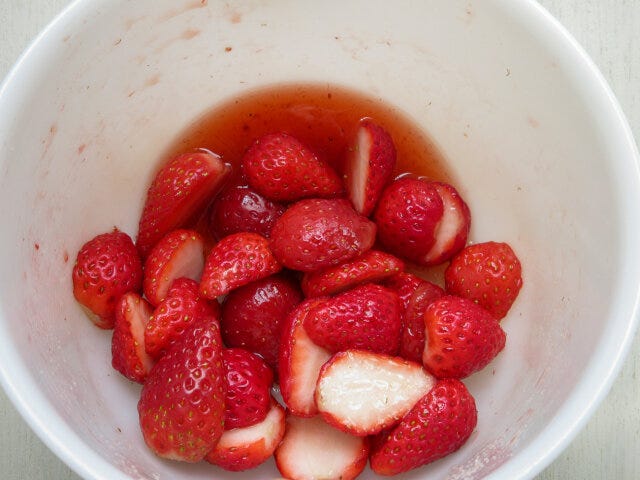 ① いちごはヘタをとり、縦半分に切ります。砂糖大さじ1をまぶし、しばらく置いておきます。写真のように、いちごと砂糖がよく馴染み、水分が出てくればOK!