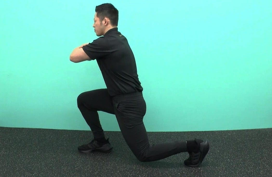 ランジ足を前後に開いた姿勢で、股関節や膝関節の曲げ伸ばしを行うエクササイズです。