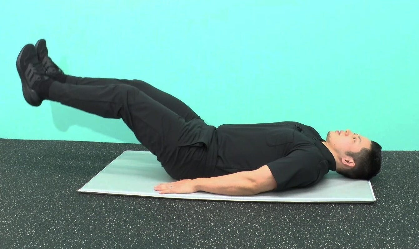 仰向けで寝て、脚をまっすぐに伸ばし、手は横へ 腰を床につけるように意識しながら、両脚を床から少し浮かせる 垂直まで浮かせたら、ゆっくりと元の姿勢に戻る。脚は床から少し浮かせたままにしておく この動作を繰り返す