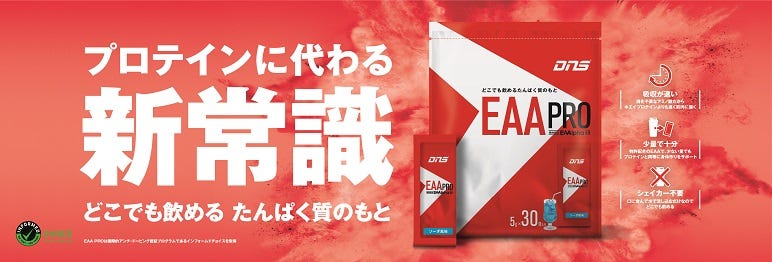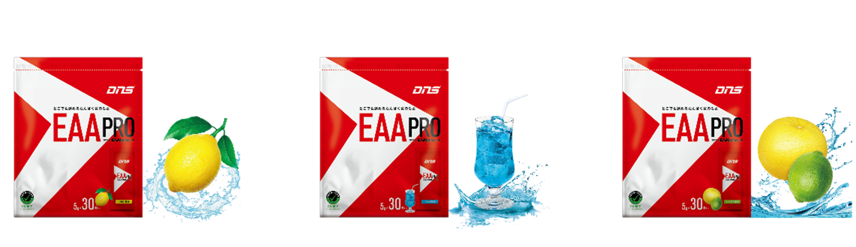 DNSが発売するEAA製品「EAA PRO」は、必須アミノ酸9種類とアルギニンの配合比率において、米国特許を取得したアミノ酸ブレンド「EAAlpha(イーエーエーアルファ)」で構成された国内唯一のEAA製品です。