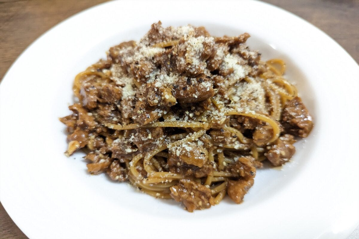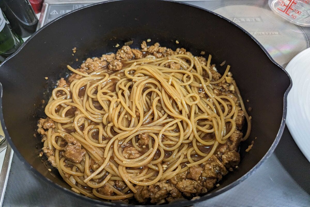 アルデンテはあまり気にせず、しっかりソースを麺に吸わせる感じで調理していき、水分がほぼなくなったらOK。もし麺を食べてまだ硬かったら、少し水を足して加熱時間を増やそう。