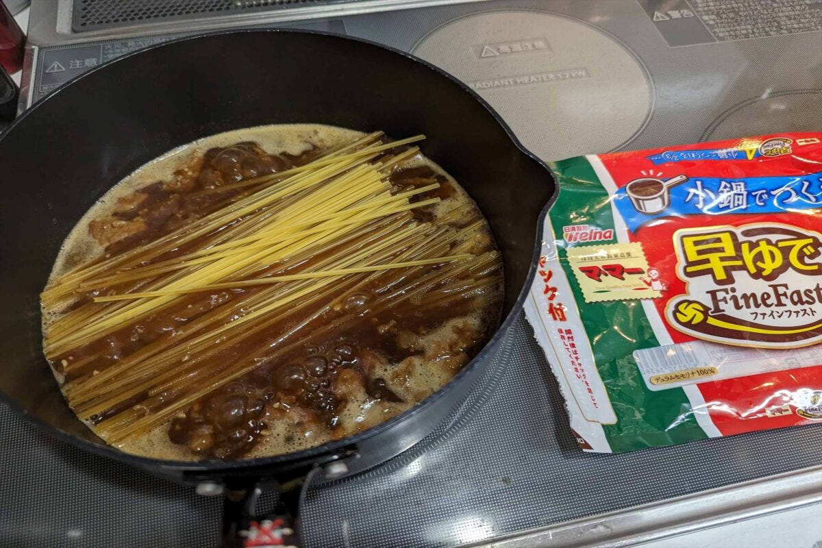 気になる味だが、マルシンハンバーグの食感がとても楽しく、パスタにハンバーグとシチューの旨味が合わさって最高。これがソース代100円ちょっとでできるのだから驚きである。