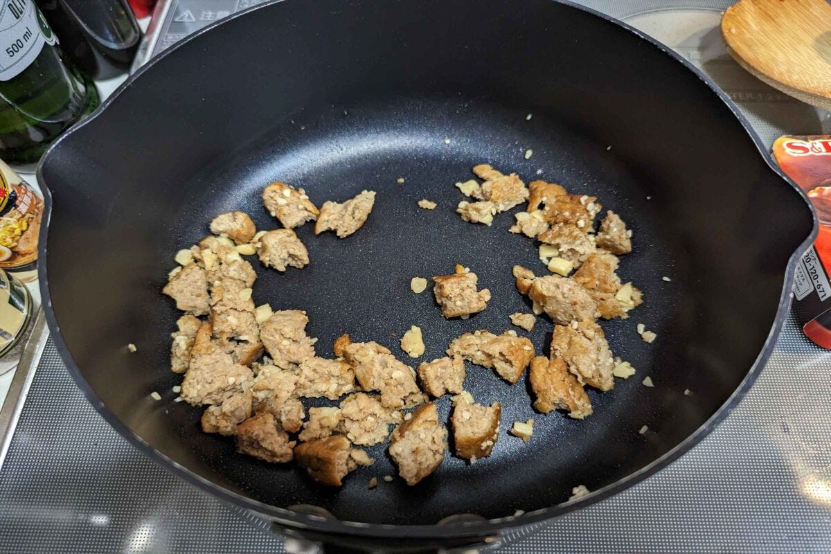 まずはフライパンを熱し、マルシンハンバーグを砕いて炒める。この際ににんにくを加えるとマルシンハンバーグに付いている脂で香りを抽出できるので、お好みで入れると良い。