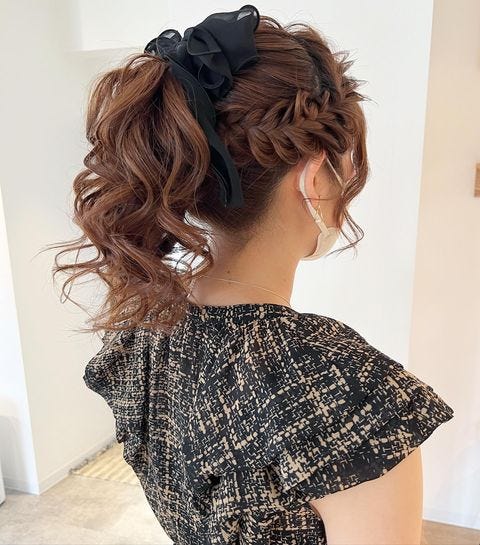こちらではサイドに編み込みをしてから、全体を高めにとめて、巻き髪をすることで大人のお出かけシーンにもピッタリなポニーテールに仕上げています。