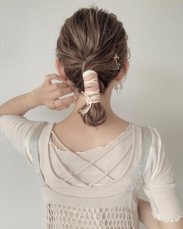 でも、こちらのように全体の毛束をねじってから折り曲げ、ゴムでとめてから紐を巻き付けるヘアアレンジなら、すっきりとしたお団子ヘアが作れるので春夏におすすめです。