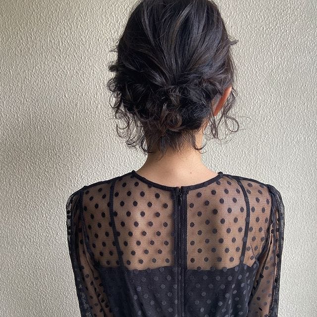 でも、こちらのように毛先をまとめきらないお団子のヘアアレンジなら、レイヤーの毛先もおしゃれに仕上がりますよ。