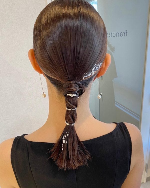 シルバーのヘアアクセが大人っぽい仕上がりですね。