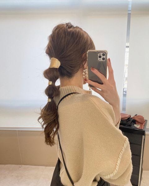 全体を低めにまとめてから毛先に向かってバランスを見てゴムを巻き付けるだけでできる玉ねぎヘアも、おしゃれなポニーフックで飾ることで、春夏のお出かけにぴったりな華やかな雰囲気に仕上がりますよ。