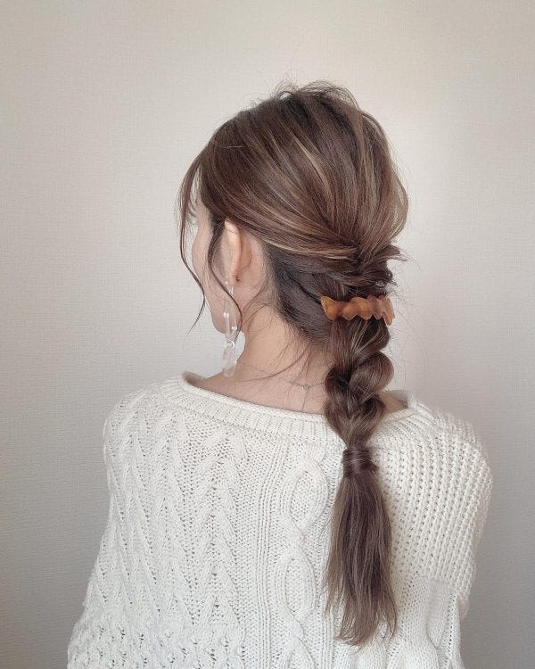 やり方はタイトなローポニーテールを作ってから、少し毛束をとって根元に巻き付け、ねじり編みしてミニカフをつけます。