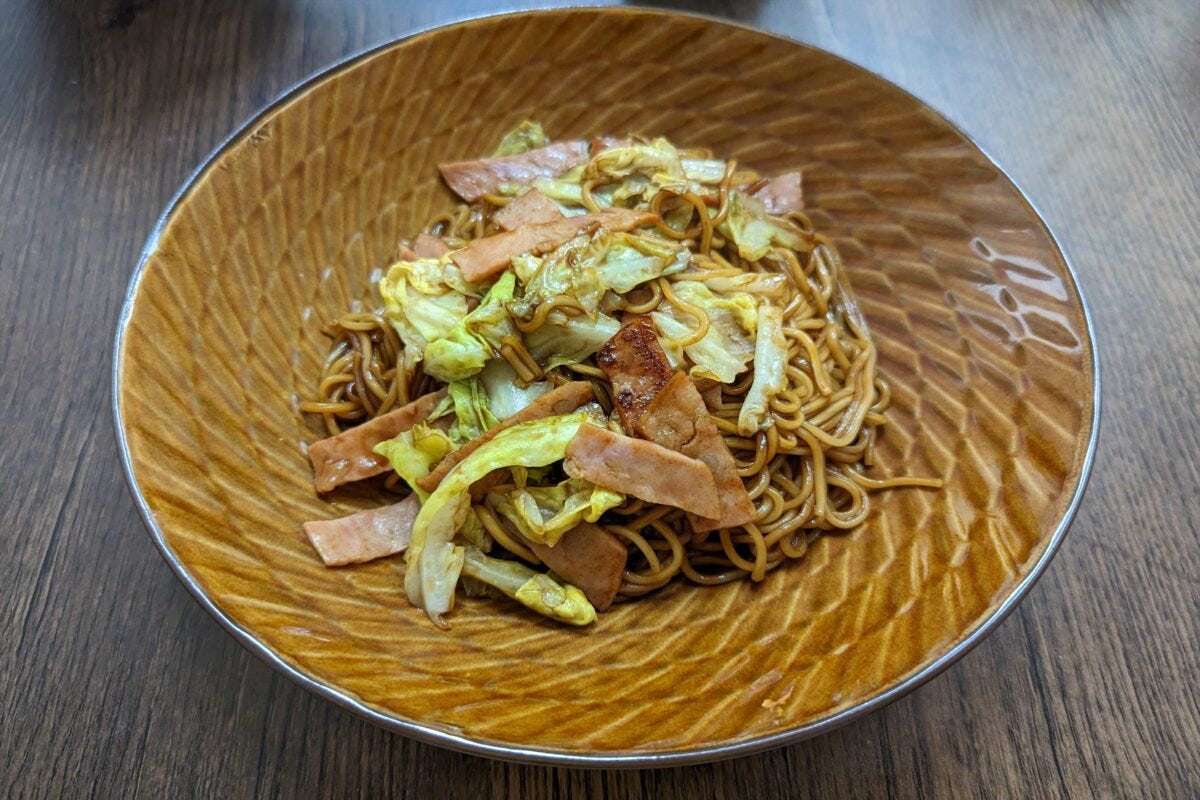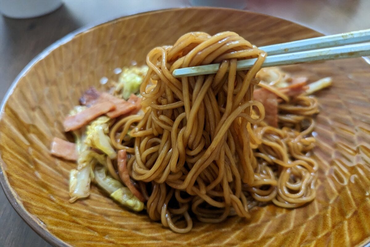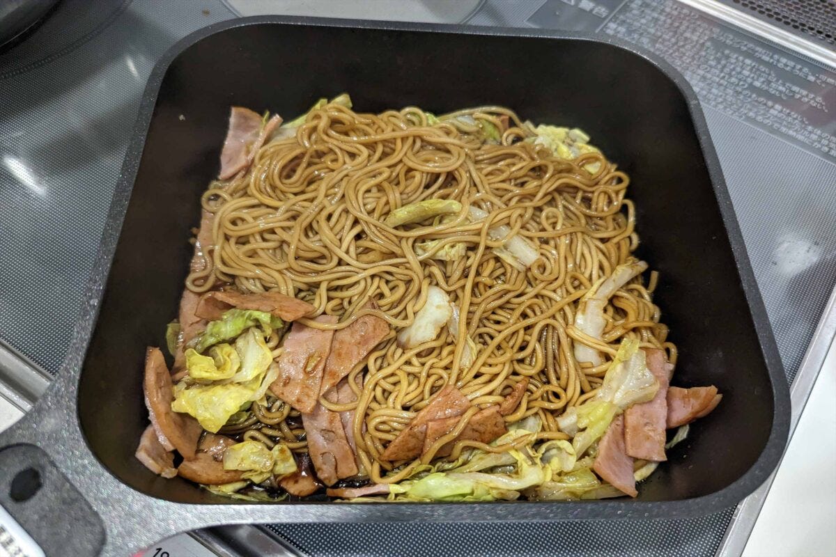 これが想像以上に美味。公式オススメのようにフライパン調理だと具材を入れられるため、美味しいソースの風味がキャベツやハムに付くだけでなく、具材の味わいが麺にも移るので、より美味しく食べられるのだ。