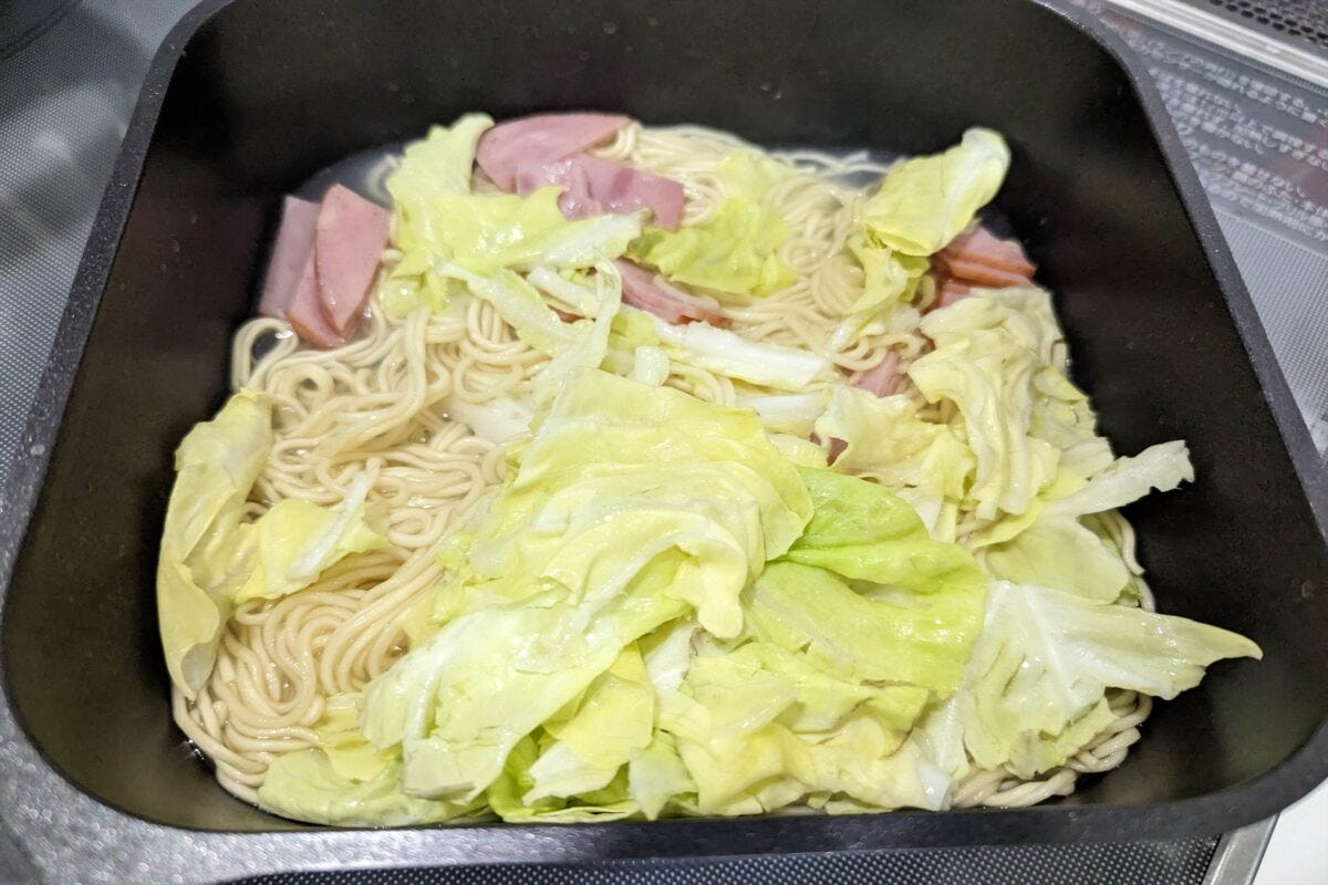 その後にお好みで具材を入れるのだが、公式のオススメは豚肉とキャベツ。今回は豚肉が無かったので、ハムを代わりに入れてみた。