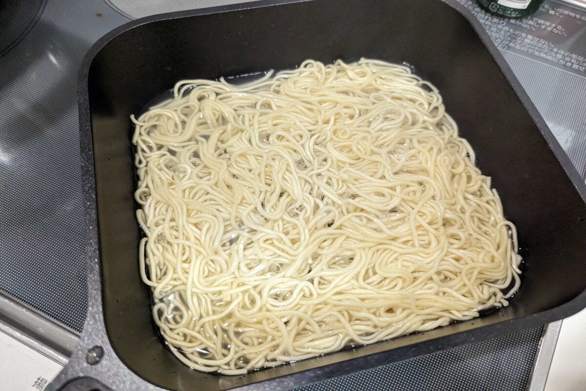 調理方法は袋麺の日清焼きそばと同様にフライパンにお湯を入れて沸騰させ、麺を入れてほぐしていく。