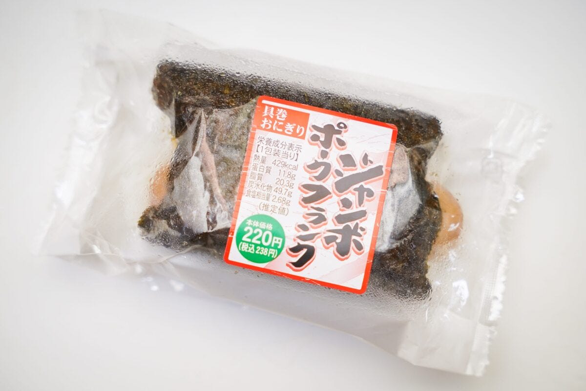 そして、もう1つもおにぎりコーナーで発見した『ジャンボポークフランク具巻おにぎり』だ。238円と若干高めの価格となっているが、それ以上にフランクフルト具材にしてしまうという発想に驚かされる。