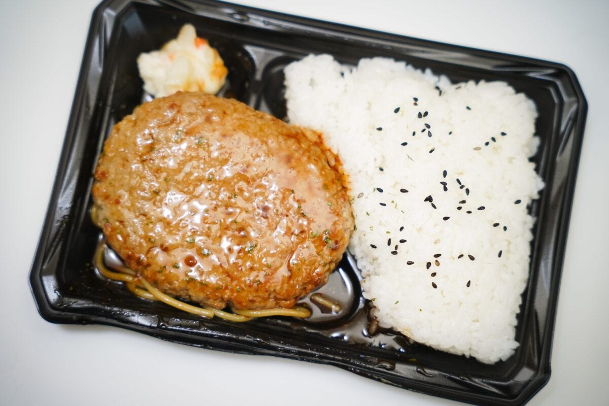 そしてラストが『BIGハンバーグ弁当(フォンドボーデミ)』となる。大きなハンバーグが入った弁当なのだが、価格は378円とかなり抑えめ。中に入っているのはハンバーグ、ごはん、ポテトサラダ、ガロニのみというシンプルな構成で個人的には嬉しいところ。