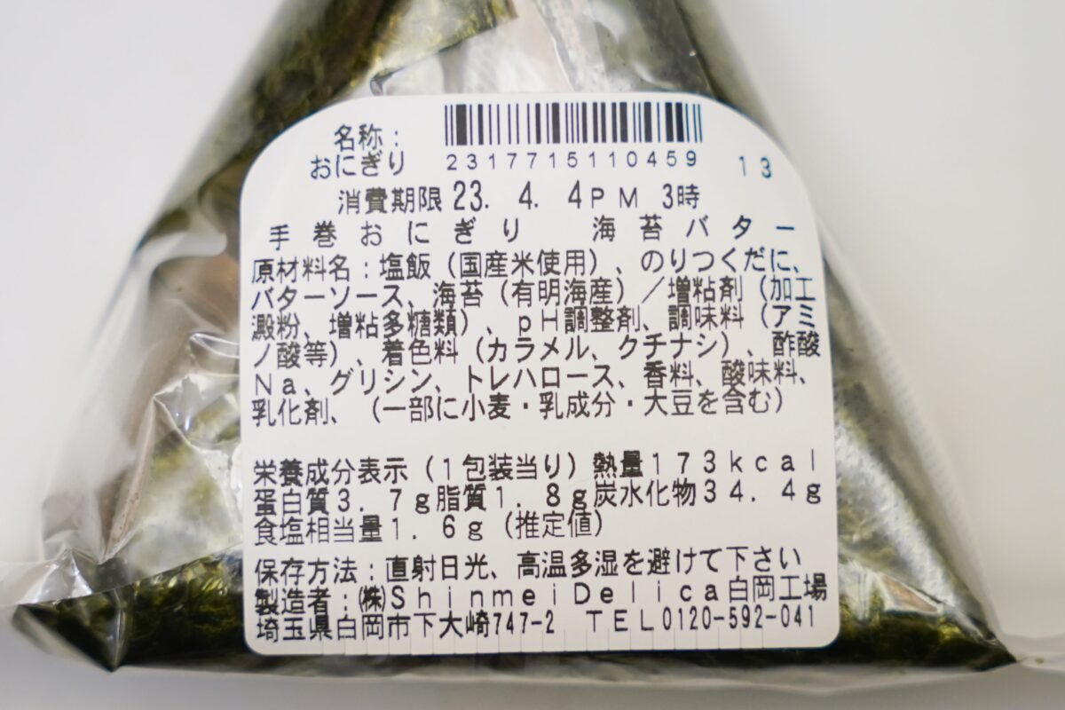 おにぎりの具といえば鮭や梅、たらこ、ツナマヨ、おかかなど様々だが、これは海苔バター。そもそも海苔バターってなんだ...? と気になる原材料を確認したところ、どうやら海苔の佃煮とバターソースを組み合わせたもののよう。