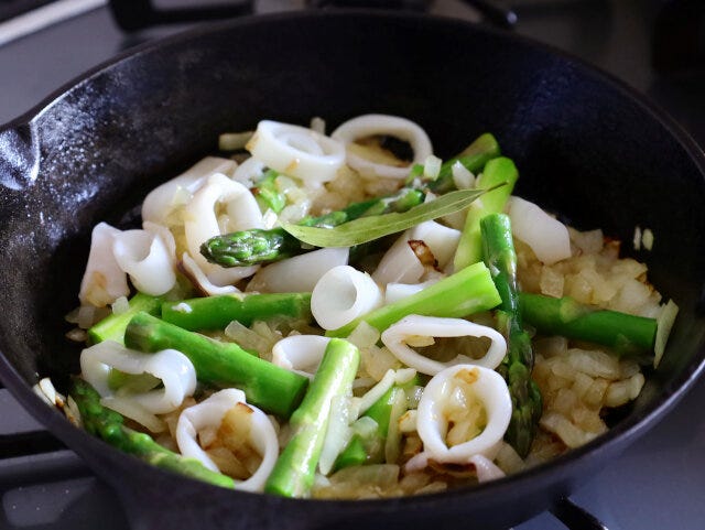 ② アスパラガスは4等分に切り、ヤリイカは1cmほどの筒切りにして入れたら、さっと炒める。