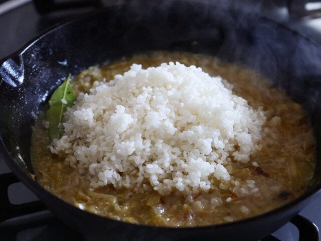 ⑤ 米と水、顆粒ブイヨン、塩、ローリエを入れ、軽く混ぜたらフタをする。沸々してきたら弱火にして、12分ほどまたは好みの固さになるまで炊く。