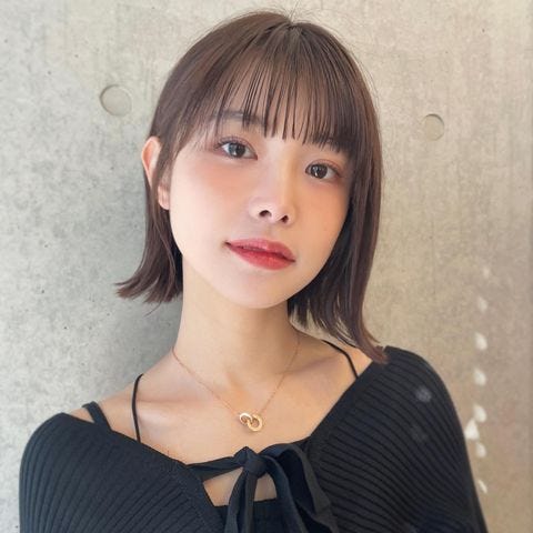 短めのワイドバングで若々しい印象となりますが、子どもっぽくなりすぎない落ち着いたアッシュベージュカラーでバランスが取れています。