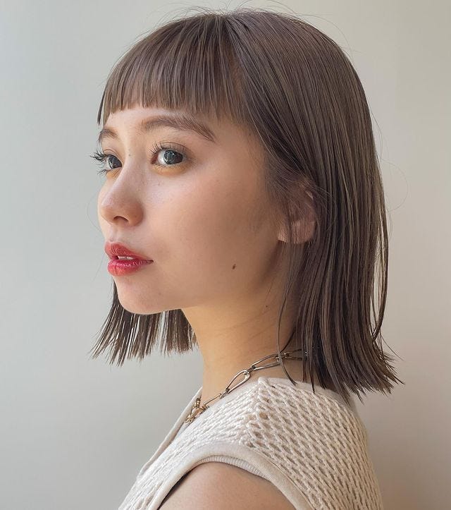 ぱつっとカットされた毛先が目を引く大人可愛い切りっぱなしボブは、おしゃれ度も抜群でこなれ感たっぷりな仕上がりですね。