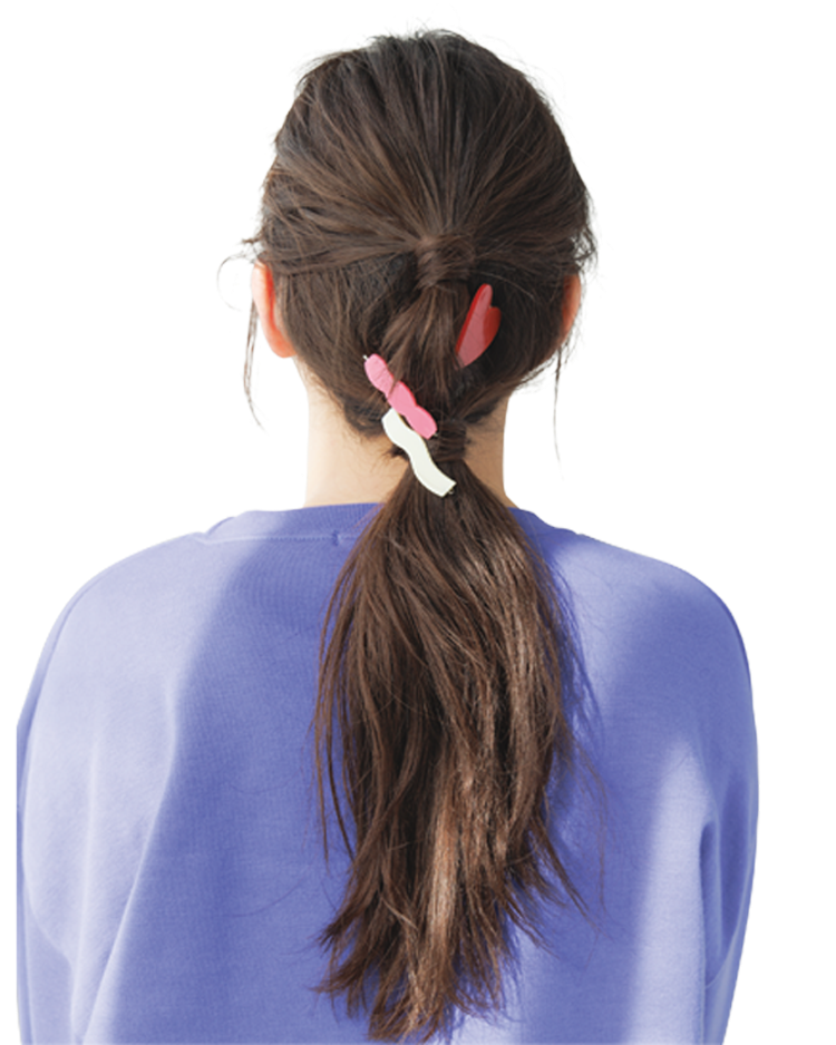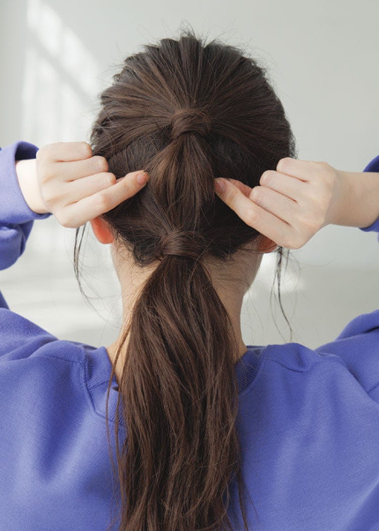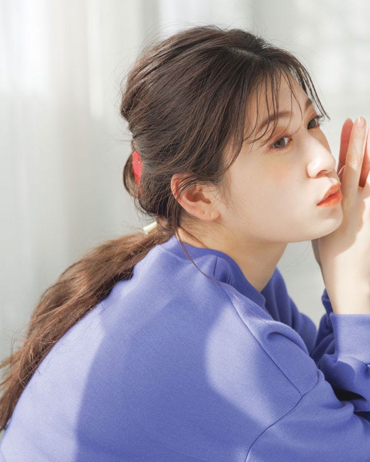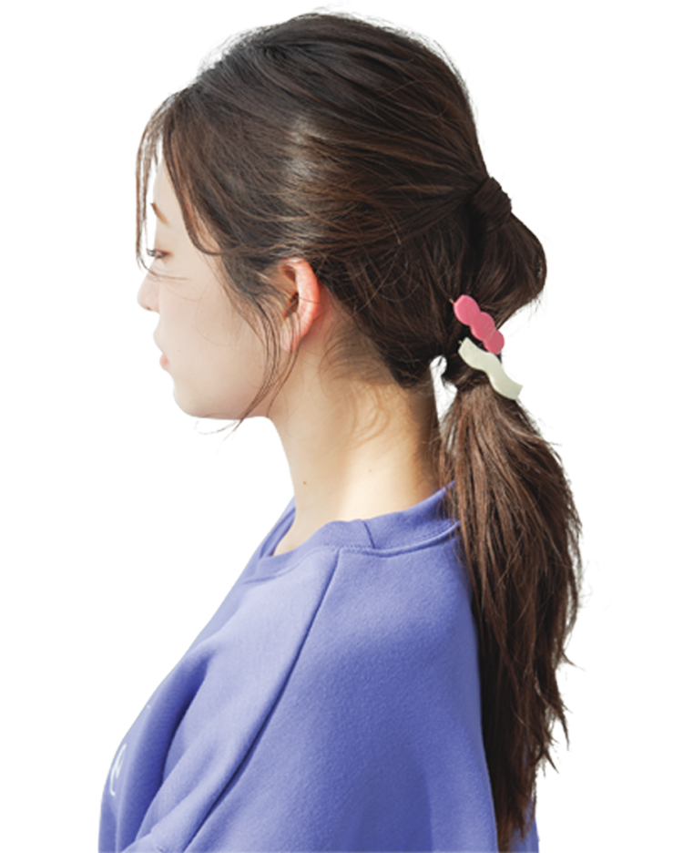 カジュアル服とあうポニーにトレンド感を加えるなら、韓国っぽデザインのピンをトッピング。ピンだけが浮いて見えないように、ひと手間加えてポニーも変形にアレンジ!