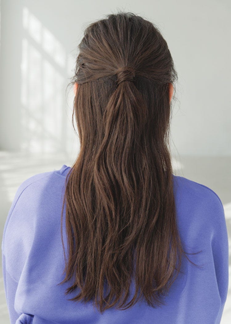 上半分の髪をまとめてゴムで結びハーフアップにする。まとめた髪から細い毛束をとり、結び目に巻きつけゴム隠しをしておく。