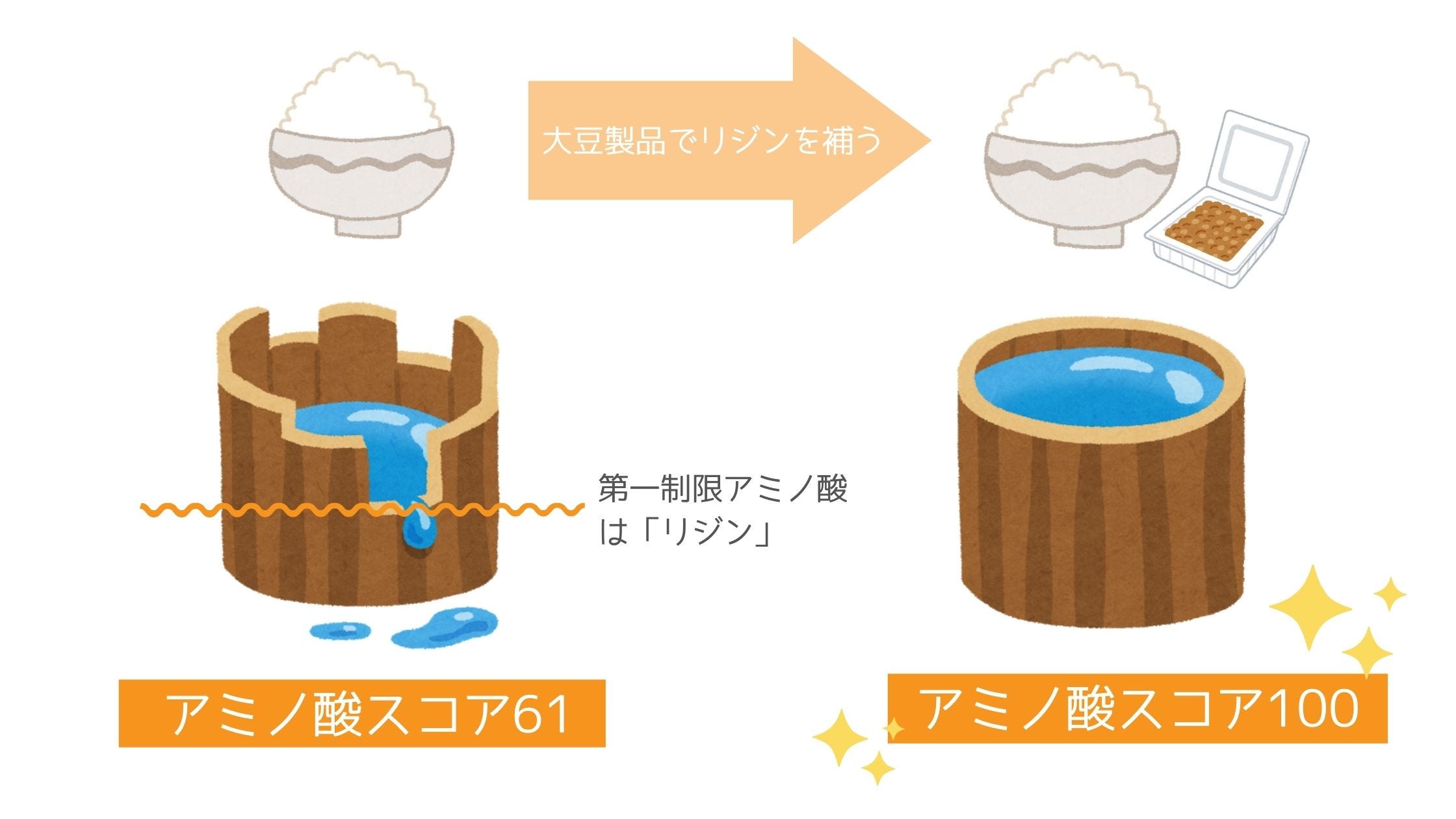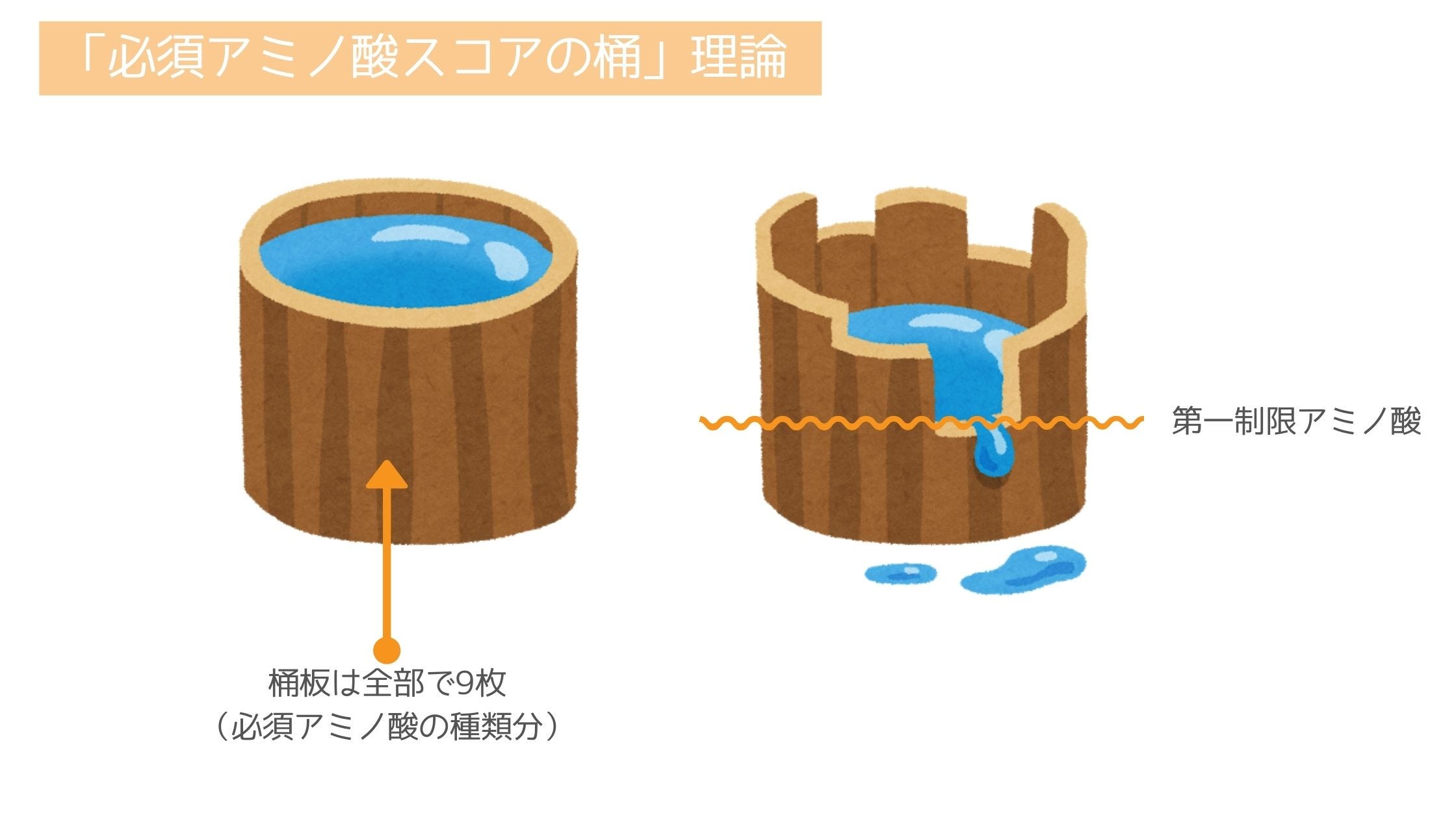 「必須アミノ酸の桶」理論で考えてみましょう。バラバラの板を組み合わせて作った桶があります。桶の板は食品あたりの各アミノ酸、桶の長さはアミノ酸含有量に例えられます。
