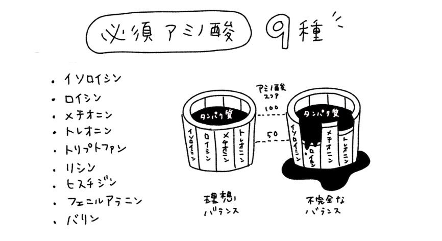 この桶板は全部で9枚(必須アミノ酸の種類分)あり、組んだ板の中でもっとも短い板を「第一制限アミノ酸」と呼びます。