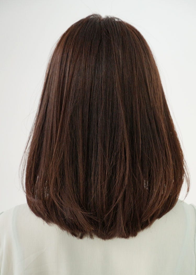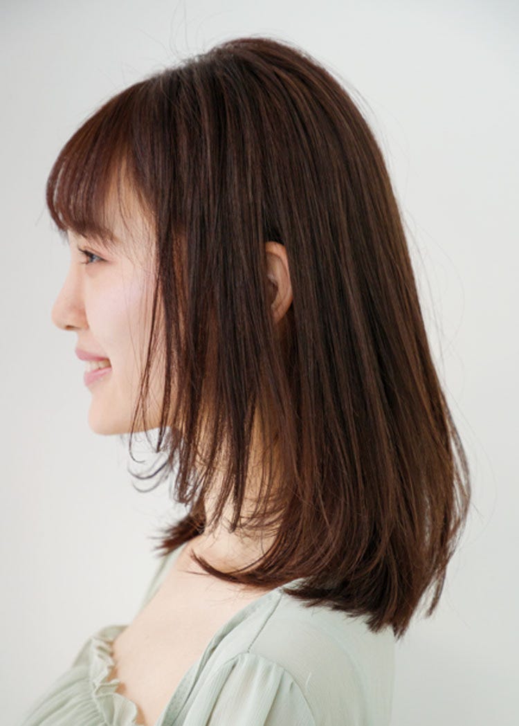 もともとクセ毛のため、ストレートパーマをかけた状態の重めAラインミディが、基本のヘアスタイル。毛量多めだけど、髪質はやわらかめなので、カットの仕方でぐんと軽やかに。