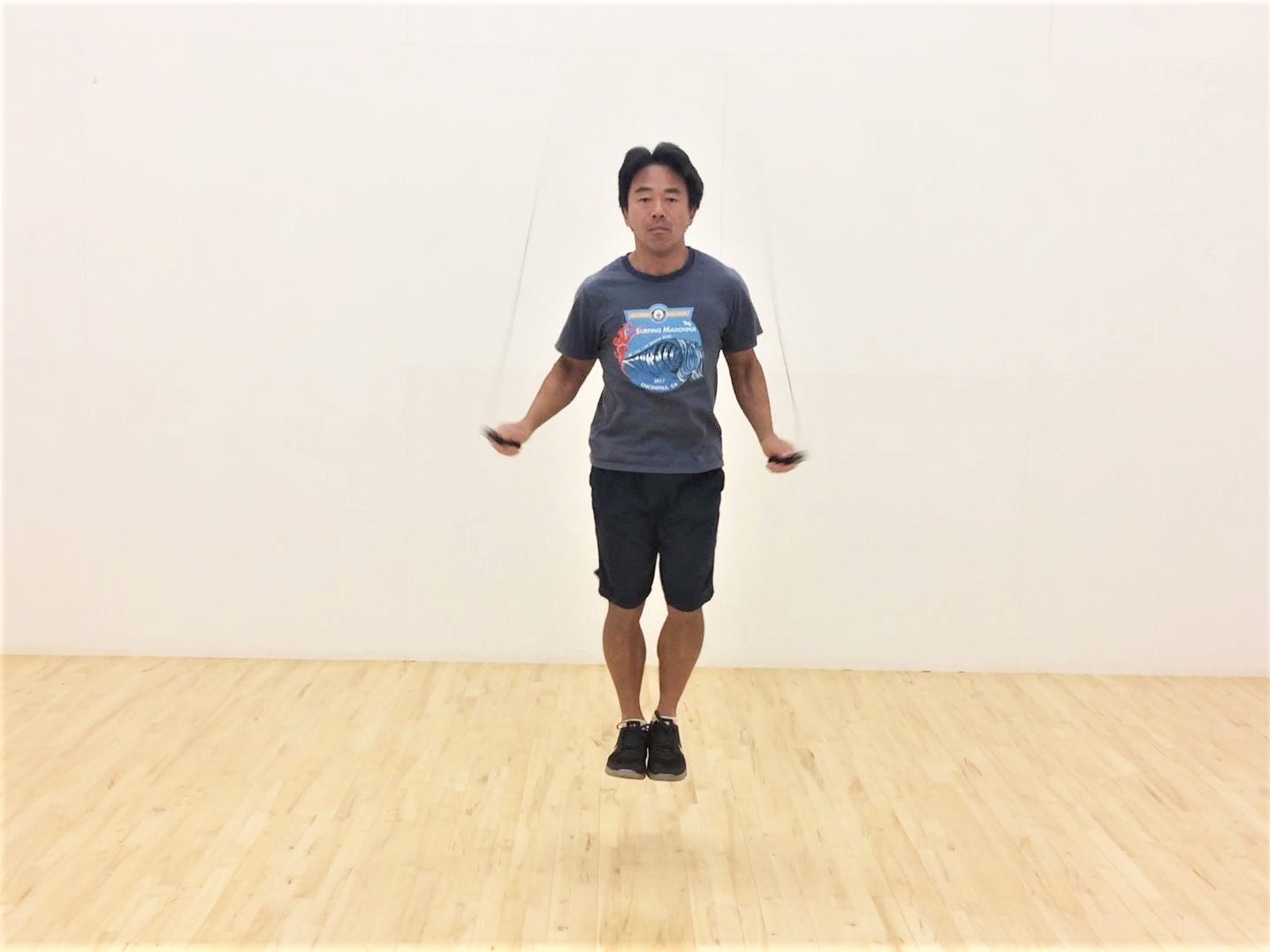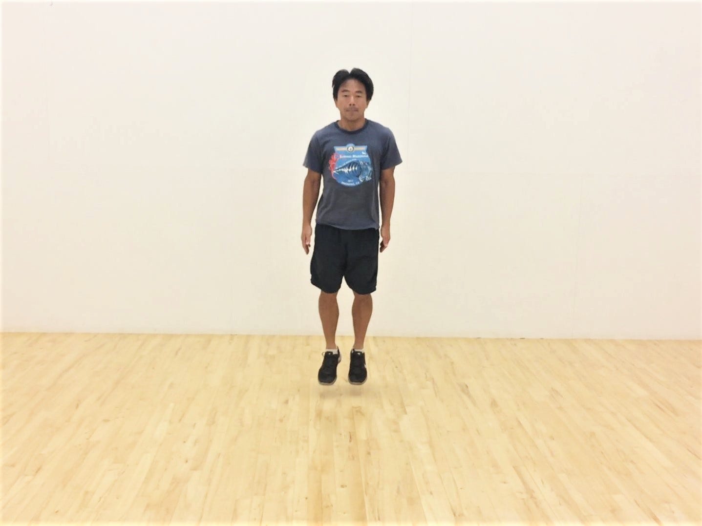 二重跳びではその高さのジャンプを連続して行うわけですが、姿勢を崩したり、場所を動いたりしないように注意してください。そのため、まずはロープを持たず、ジャンプを数回繰り返す練習を行います。