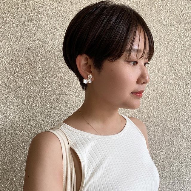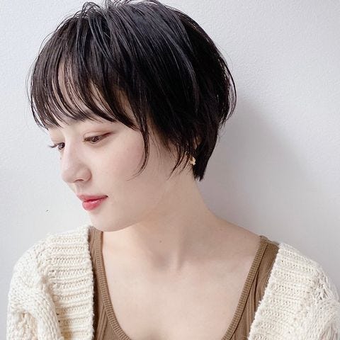 高さが控えめで前髪ありのシンプルショートは、面長さんに人気があります。