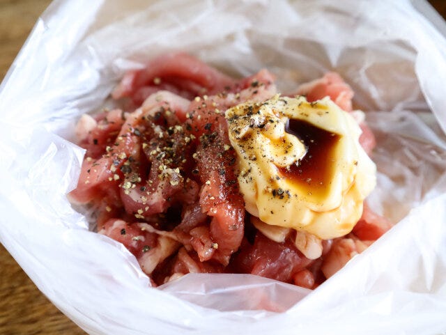① ビニール袋に、豚小間、しょう油、マヨネーズ、黒こしょうを入れ、袋の上から混ぜながら揉む。