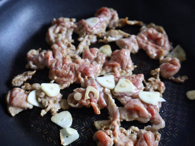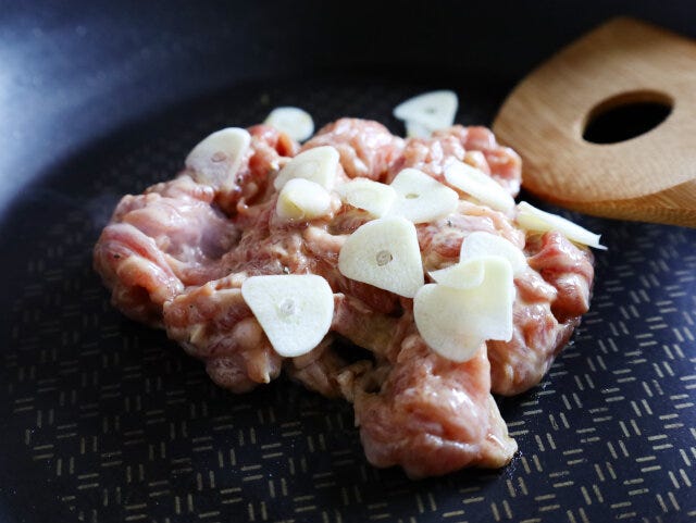 ② フライパンンに1と薄切りにしたにんにくを入れ、火を点ける。
