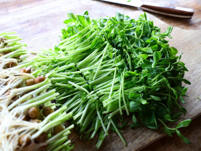豆苗は洗って、根元を切り落としたら、3~4等分の長さに切っておく。