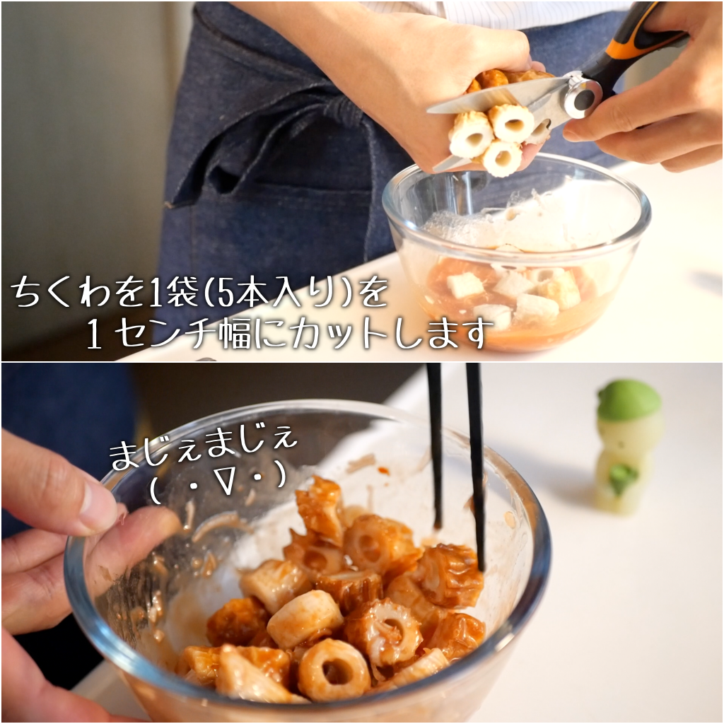 ちくわをキッチンはさみで1センチ幅に切り、①に加えて混ぜましょう。