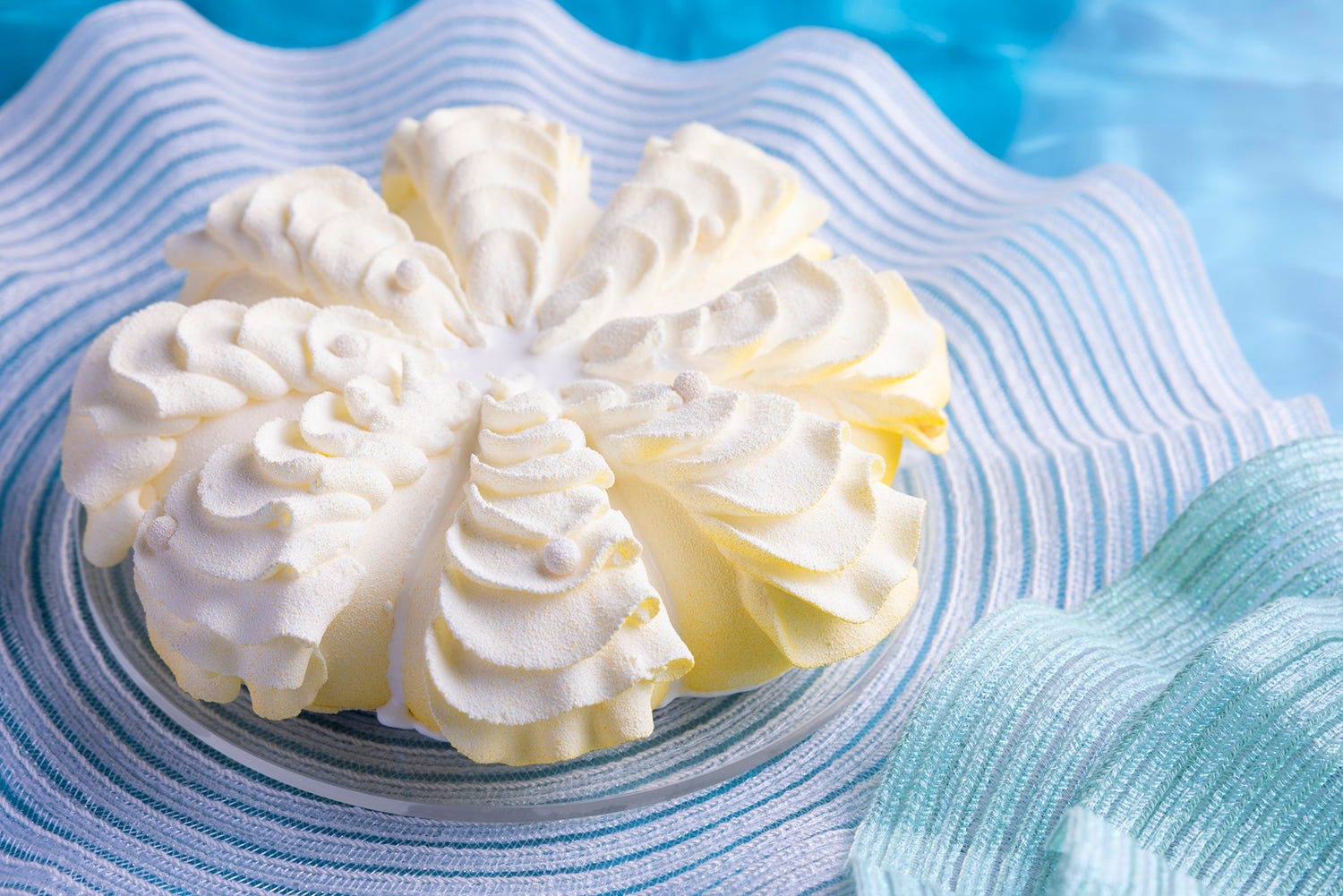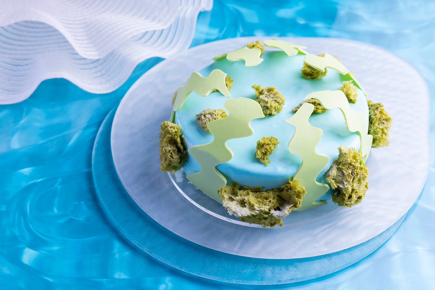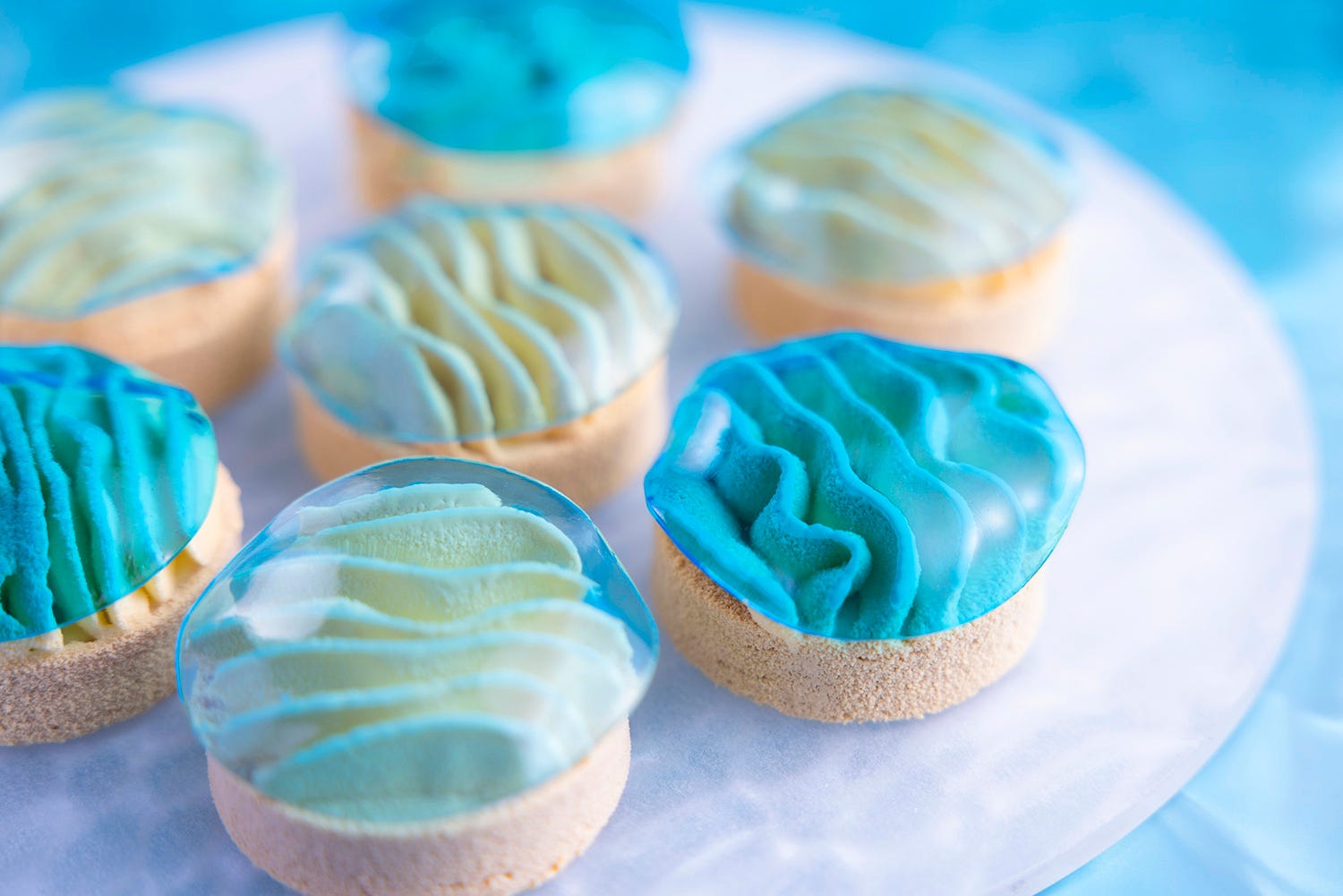 透明感ある宮古島の海と白い砂浜をイメージした「ブルーウォーター&サンズ」は、エキゾチックムースに爽やかなフロマージュブランのムース、クミンやカルダモンが香るビスキュイを合わせた一品。