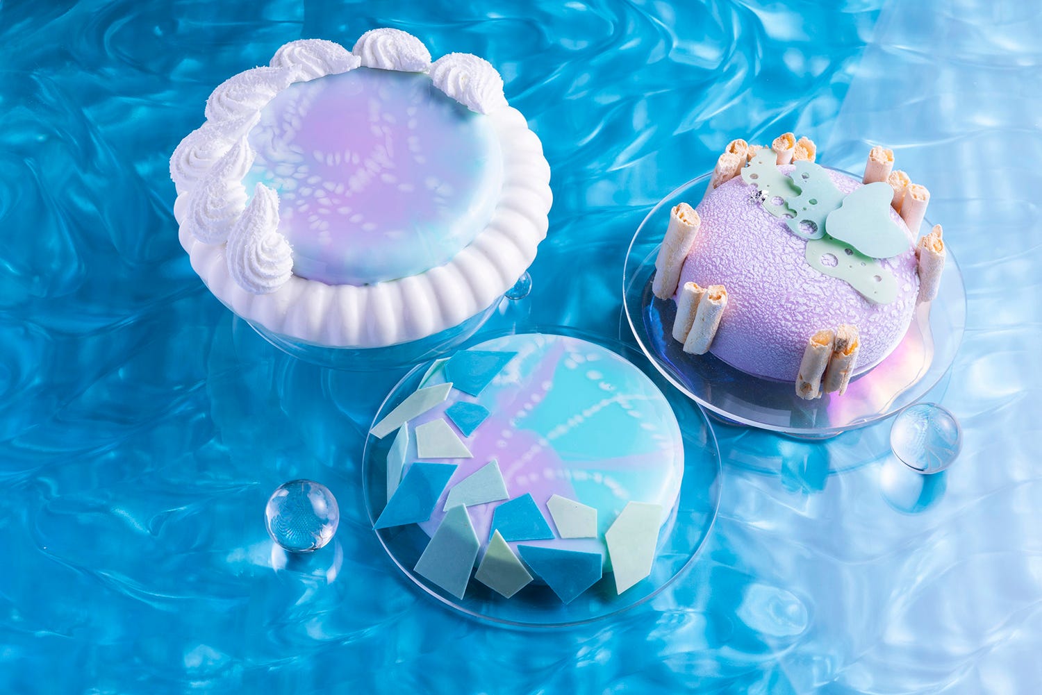 「貝に閉じ込めた秘密」には、沖縄のさんぴん茶を使いマンゴーとあわせ、バニラの香りやココナッツの食感と共に味わえる。キラキラと光る「シーオブ・タルト」は、藻塩とミルクチョコのクリームを波のように絞り、タルトの上には、グレープフルーツの寒天をON。