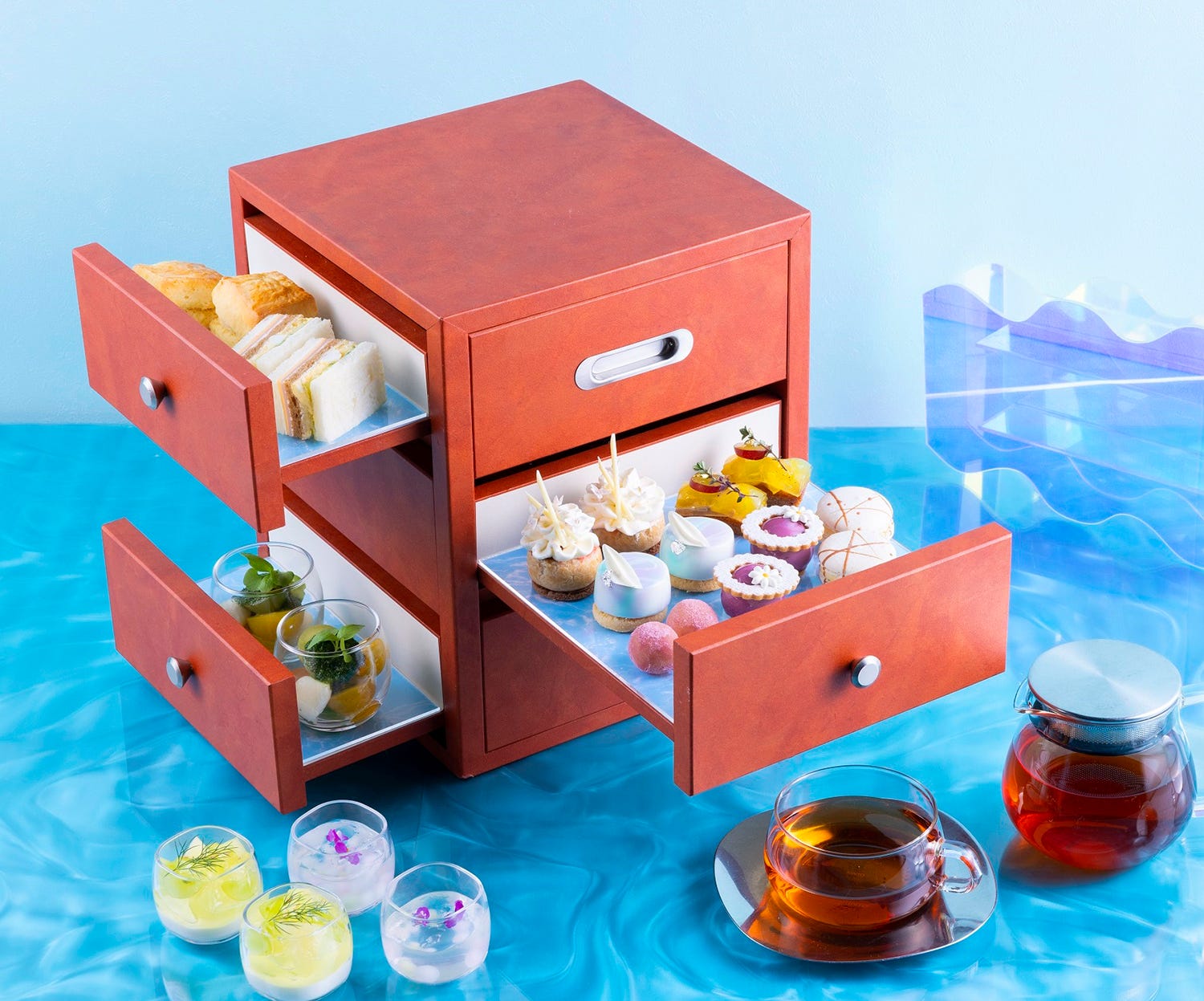 さらに期間中、1F「MYPLACE(マイプレイス)」カフェ&バーにてアフタヌーンティーセットが楽しめ、ジュエリーケースのようなアフタヌーンティーボックスにスイーツを詰めて用意。